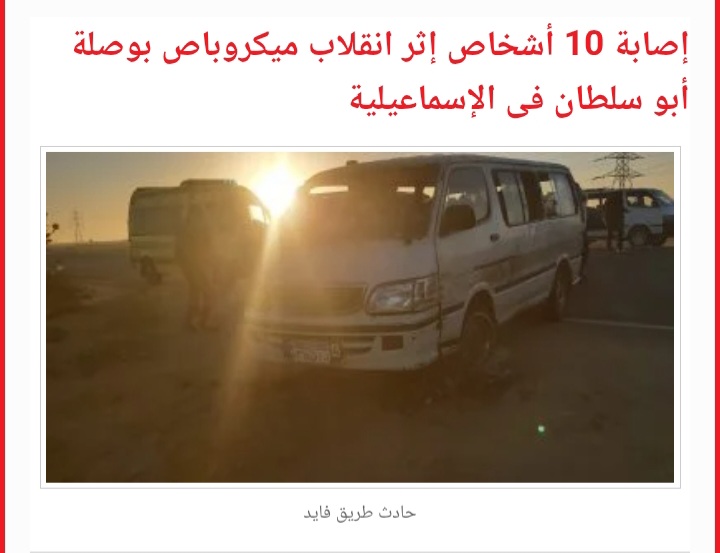 تلقت الأجهزة الأمنية بمديرية أمن الإسماعيلية إخطارا من مأمور مركز فايد يفيد بورود بلاغ بانقلاب سيارة ميكروباص بطريق القاهرة فايد وصلة ابوسلطان دائرة مركز فايد واضاف البلاغ بوجود عدد من المصابين.