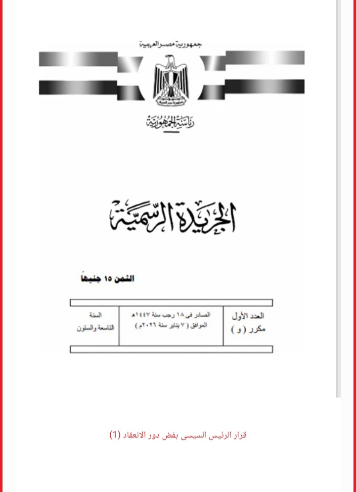 نشرت الجريدة الرسمية قرار السيد الرئيس عبد الفتاح السيسى، رقم 11 لسنة 2036 بفض دور الانعقاد العادى السادس من الفصل التشريعى الثانى لمجلس النواب، اعتبارا من يوم الخميس 19 من رجب سنة 1447 هجرية، الموافق 8 من بناير سنة 2026 ميلادية .