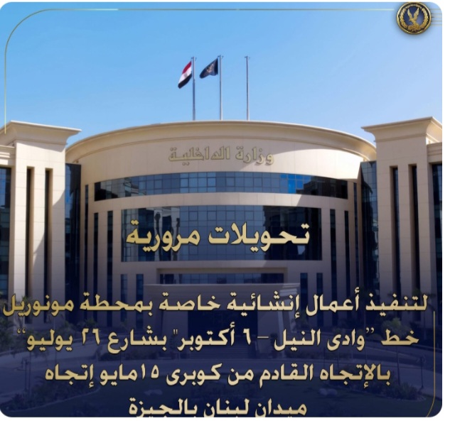 تقوم الإدارة العامة لمرور الجيزة بتعيين الخدمات المرورية اللازمة لمواجهة أى كثافات مرورية متوقعة وتسيير حركة المرور وذلك لتنفيذ أعمال إنشائية خاصة بمحطة مونوريل خط “وادى النيل – 6 أكتوبر” بشارع 26 يوليو بالإتجاه القادم من كوبرى 15 مايو إتجاه ميدان لبنان.. مما يستلزم غلق كلى بشارع 26 يوليو بالإتجاه القادم من كوبرى 15 مايو إتجاه ميدان لبنان لمدة 3 أيام إبتداءً من يوم الجمعة الموافق 9-1-2026وحتى صباح يوم الأحد الموافق 11-1-2026 على أن تكون الأعمال بدءاً من الساعة 12 صباحاً وحتى الساعة 5 صباحاً.. وإجراء تحويلات مرورية على النحو التالى:
