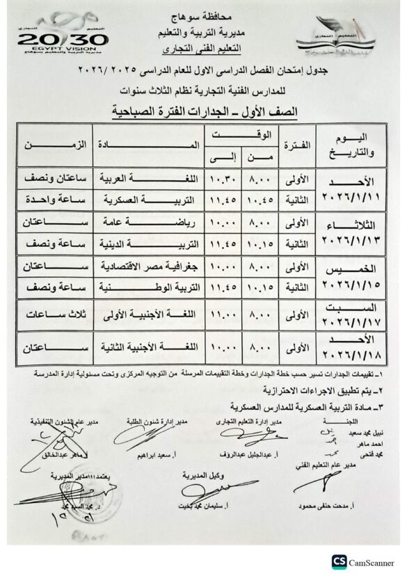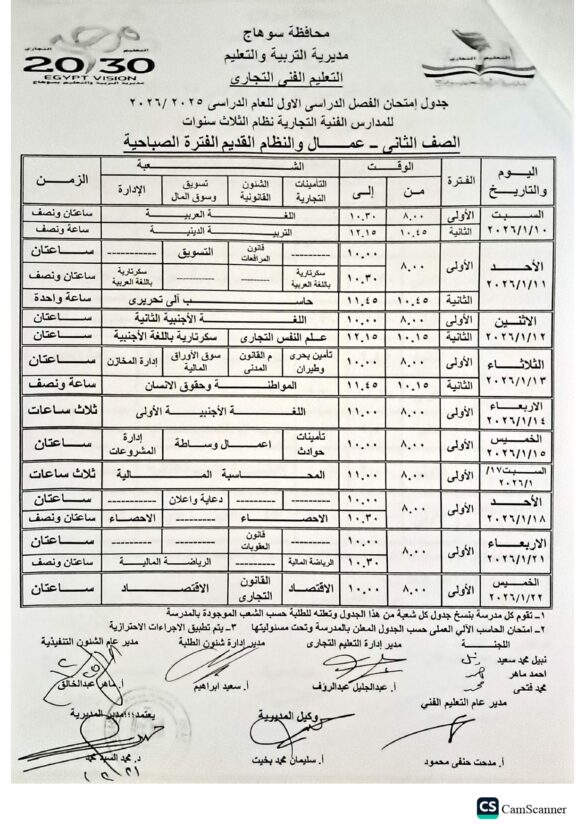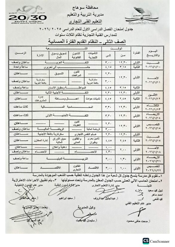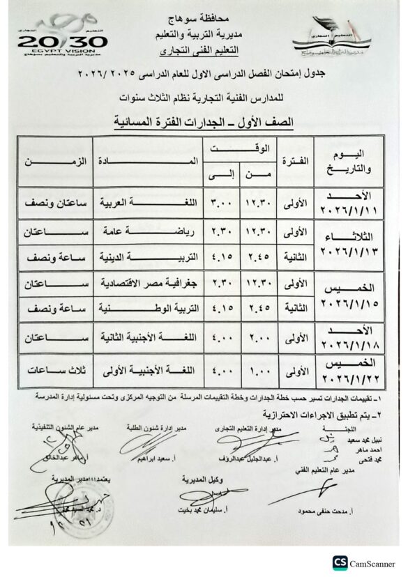 أعلنت مديرية التربية والتعليم بسوهاج بقيادة الدكتور محمد السيد وكيل وزارة التربية والتعليم جدول امتحانات الفصل الدراسي الأول للتعليم التجاري